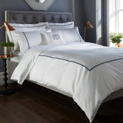 White Austell 800 Thread Count Duvet Cover with Navy Double Cord Embroidery
